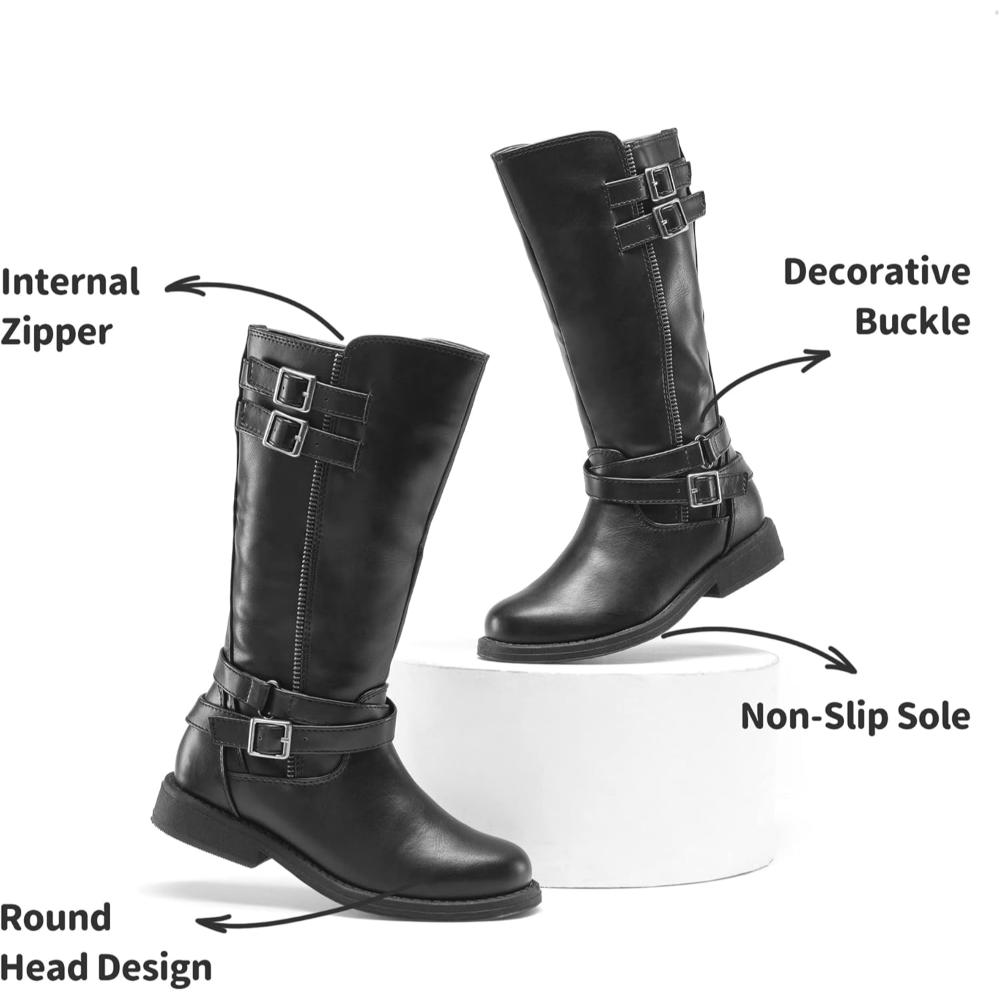 Fashion Riding Boots for Toddler Girls offer a timeless option for cooler months and everyday wear. Toddler Girls Riding Boots Designed with a classic round-toe silhouette and buckle strap detail, these boots bring structure and style to seasonal wardrobes. Built for practicality, the boots feature a side zipper, allowing for quick setup and removal without the need for multiple fasteners.