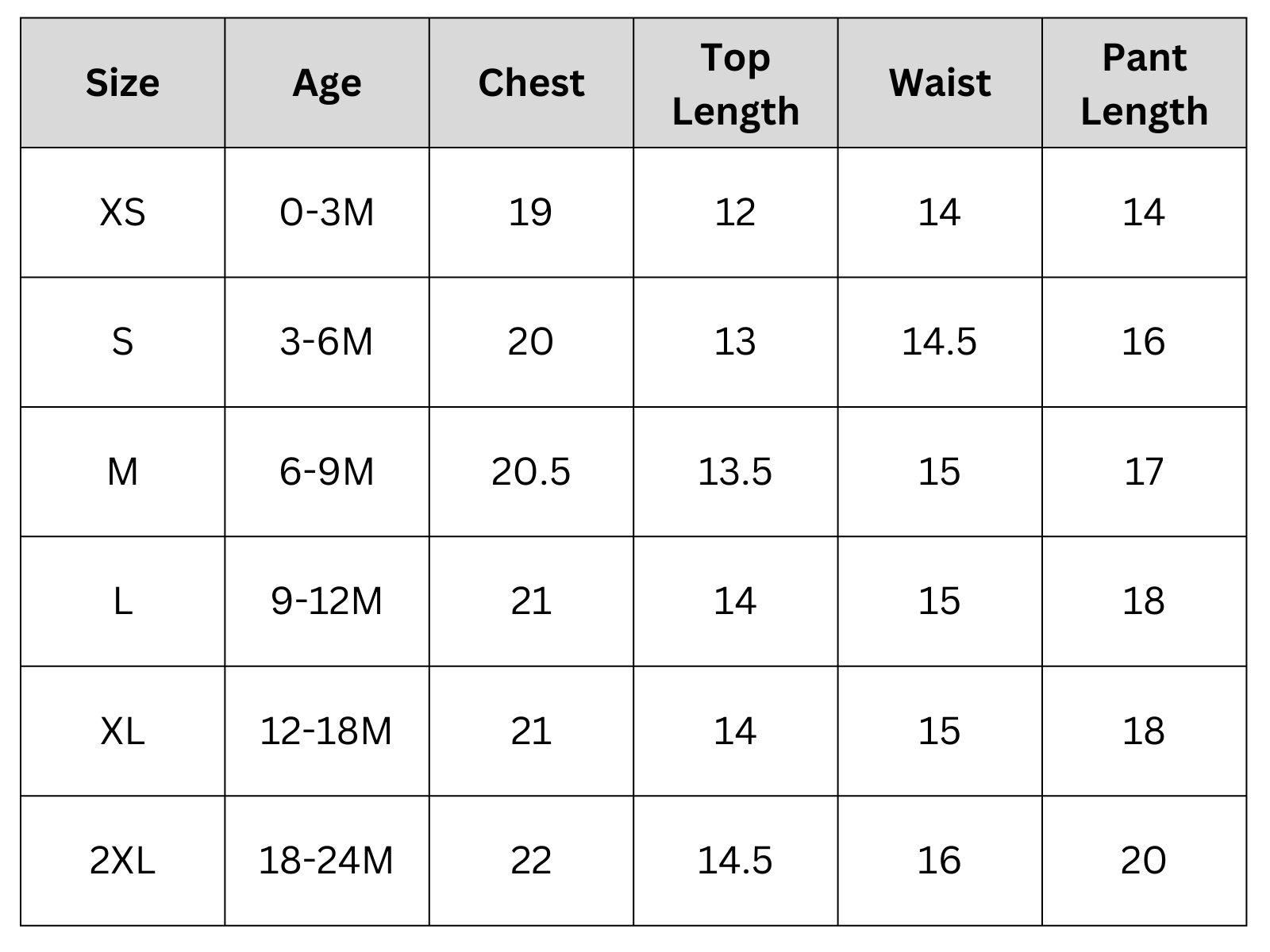 Size Chart (inches):